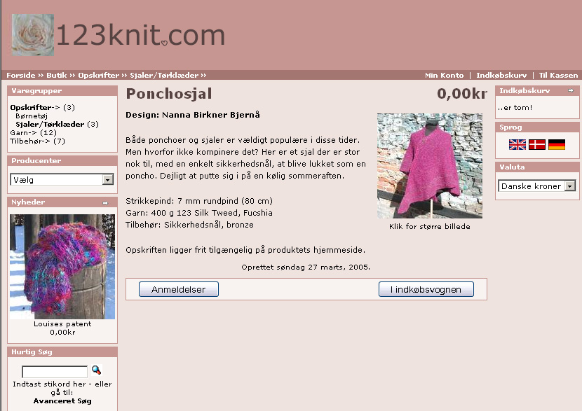 <- Februar 2005 | April 2005 -> Marts 200527. Marts - Mit Ponchosjal er blevet færdigt Da jeg skulle afsted til Falster på strikkeweekend for nogle uger siden, måtte jeg have noget ikke alt for kompliceret at strikke på - og det blev så til ponchosjal. Et sjal der er så "bredt", at det kan lukkes som en poncho.