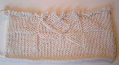 Strikkerne på Falster havde, som jeg nævnte ovenfor, en forkærlighed for drejede masker, og det er ærligt talt en herlig udfordring at forsøge, at gøre dem kunsten efter. Prøv at lave en snoning over to masker på følgende måde: "Strik anden maske drejet ret foran første maske, strik derefter første maske vrang", eller måske: "Strik anden maske drejet vrang bag første maske, strik derefter første maske ret". Det er ikke svært - bare "tricky". Du kan jo altid forsøge dig med en strikkefasthed på de der 50 masker på 10 cm, hvis du ikke føler dig udfordret... (Også er det altså ikke fordi jeg har givet op, at der ikke er nogen strikkepind på prøven, det lettede bare fotograferingen). Hvis nogen af jer der var med, læser dette, så tusind tak for en dejlig weekend. Jeg glæder mig til næste år, og måske til en tur til Estland... Skriv en lille kommentar10. Marts - Så er de første designs er ved at komme af pindene
