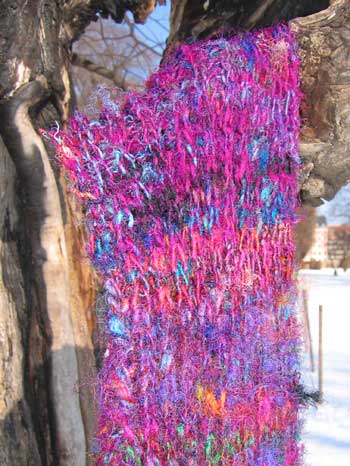 Jeg har også strikket et halsterklæde i 123 Sari Silk - mit garn i 100 % genbrugssilke. Selv om garnet på sin vis er ganske irriterende at arbejde med, er det på samme tid så fasinerende, at jeg har svært ved at ligge det fra mig. Jeg skal lige strikkes et par pinde mere, bare for at se hvordan det nu kommer til at se ud... Jeg har lidt overrasket over hvor blødt halsterklædet er blevet, da garnet er temmelig hårdt spundet. (123 Sari Silk kan I også købe i min lille onlinebutik, så snart jeg er klar til at åbne).