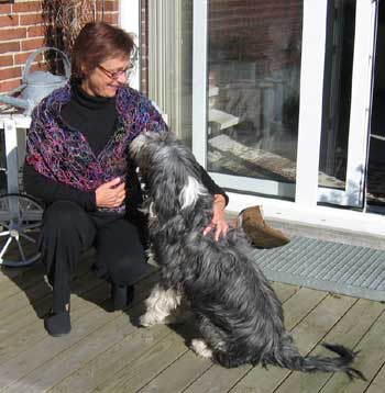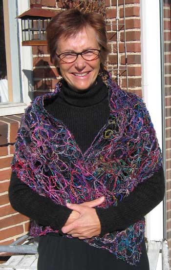 Min kreavtive mor har været i gang med silkegarnet. Det er blevet til det her sjal, som jeg slet ikke kan stå for. Også selv om hun har snydt, og hverken har brugt hæklenål eller strikkepinde ;-D. Jeg har selvfølgelig fået hende til at skrive en vejledning, hvis nogle af jer skulle have lyst at give jer i kast med sjalet - som vi endnu mangler et navn til. Nogle gode ideer? Og ja så kunne designerhunden ikke vente længere uden for billedet, så her et billede af Ann Bjernå og designerhunden Sia...