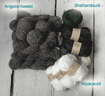 Men det var jo ikke kun nye ideer, der kom med hjem. Der kom også nyt garn. I skulle have set fællesrummet på vandrehjemmet, der var garn OVERALT. Og en del af det var til byt, salg og ren foræring. Og det var jo for fristende. Jeg er kommet hjem med angora-tweed (fra Drops), med alacauld og en sjov grøn shetlandsuld med turkise undertoner. Jo der er lidt til samlingen, men det var jo slet ikke til at stå for.
