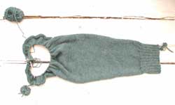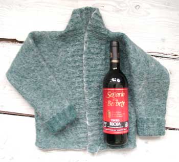 Også kommer vi til min værste strikkeoplevelse til dato: Jeg fik strikket Lara færdig, og fik monteret hende. Dette kræver jo temmeligt megen tålmodighed, for det skal jo gøres ordentligt. Og Lara blev færdig, men da hun kom på, var hun lidt lille i det. Det er jo et gammelt kendt råd, at uld kan ændres lidt i formen ved at blive vasket og tørret i passende facon, hvilket jeg så forsøgte. Og her er det så mit råd kommer: Husk at trykke knappen med "uldprogram" ind, for ellers ender jeres trøjer med at blive ligesom min Lara - en meget tykt valket børnetrøje... Jeg var godt nok ærgelig!