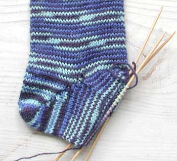 Nu har jeg strikket en del sokker med "kilehæl", og så fik jeg lyst til at prøve noget andet. Jeg har længe haft et godt øje til "timeglashælen" eller autohælen, som den vist også kaldes. Men den giver problemer. På den ende side bliver opsmalingen af maskerne pæn nok, men på den anden side bliver den fuld af huller. Hvordan undgår jeg disse huller? I opskriften jeg har benyttet står der, at jeg skal samle kæden op foran masken jeg skal strikke. Det giver som sagt et fint resultat, nå jeg gør det på retsiden, men giver huller når jeg skal strikke fra vrangsiden. Normalt kan man jo skrikke drejet ret, for at undgå hullerne, men kan man strikke drejet vrang? Jeg har strikket hælen to gange, for at tjekke, jeg ikke lavede fejl...