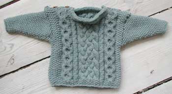 En babytrøje med herlige aranmønstre. Opskriften er fra bogen Knitting for babies af Melanie Falick og Kristin Nicholas og trøjen er strikket i rester af Rowans DK soft.