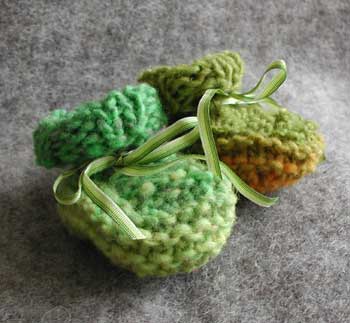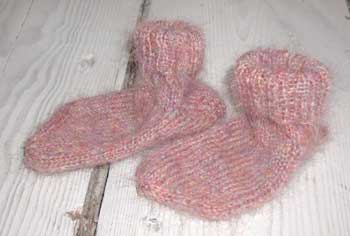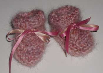 Babysko strikket i en rester af mohair garn. Opskriften er fra Kris Percivals bog Knitting Pretty.