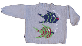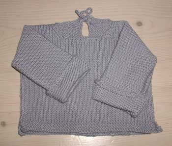 En babytrøje i wool/cotton fra Rowan. Opskriften er fra bogen Strik til ønskebørn af Erica Knight.