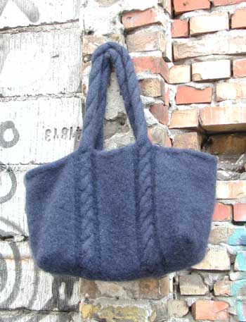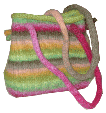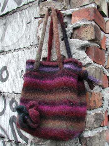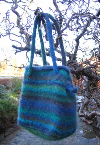 Den færdige Booga Bag. Jeg er ret vild med den - det ender med, jeg er nødt til at prøve at lave en mere... Den er strikket i Noro Kureyon (farve 95) - helt ligesom i opskriften. Opskriften er gratis og findes her