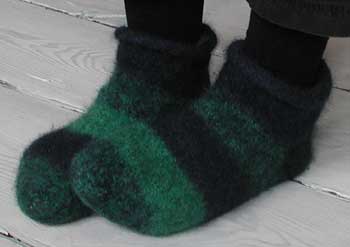 Et par gigantiske sokker i Gotlandsk pelsuld, der efter valkning er blevet til et par hjemmesko... Sokkerne er strikket med udgangspunkt i opskriften på Fuzzyfeets fra Knitty. Hæl og tå er dog strikket som jeg lige havde lyst, dvs. der er blandt andet lavet forskellige højre/venstre tær...