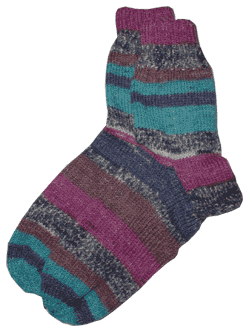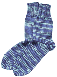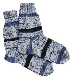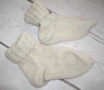 Mit første par sokker, som mor lærte mig at strikke, da jeg var på påskeferie i Gilleleje. De er strikket på pinde 4 i 100 % ren uld. De er lidt sjove, da højre og venstre sok er forskellig - så er der plads til alle tærene.
