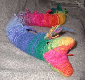 Mangefarvet slange. Opskriften er fra Birte Aartuns bog "Strik og krymp".